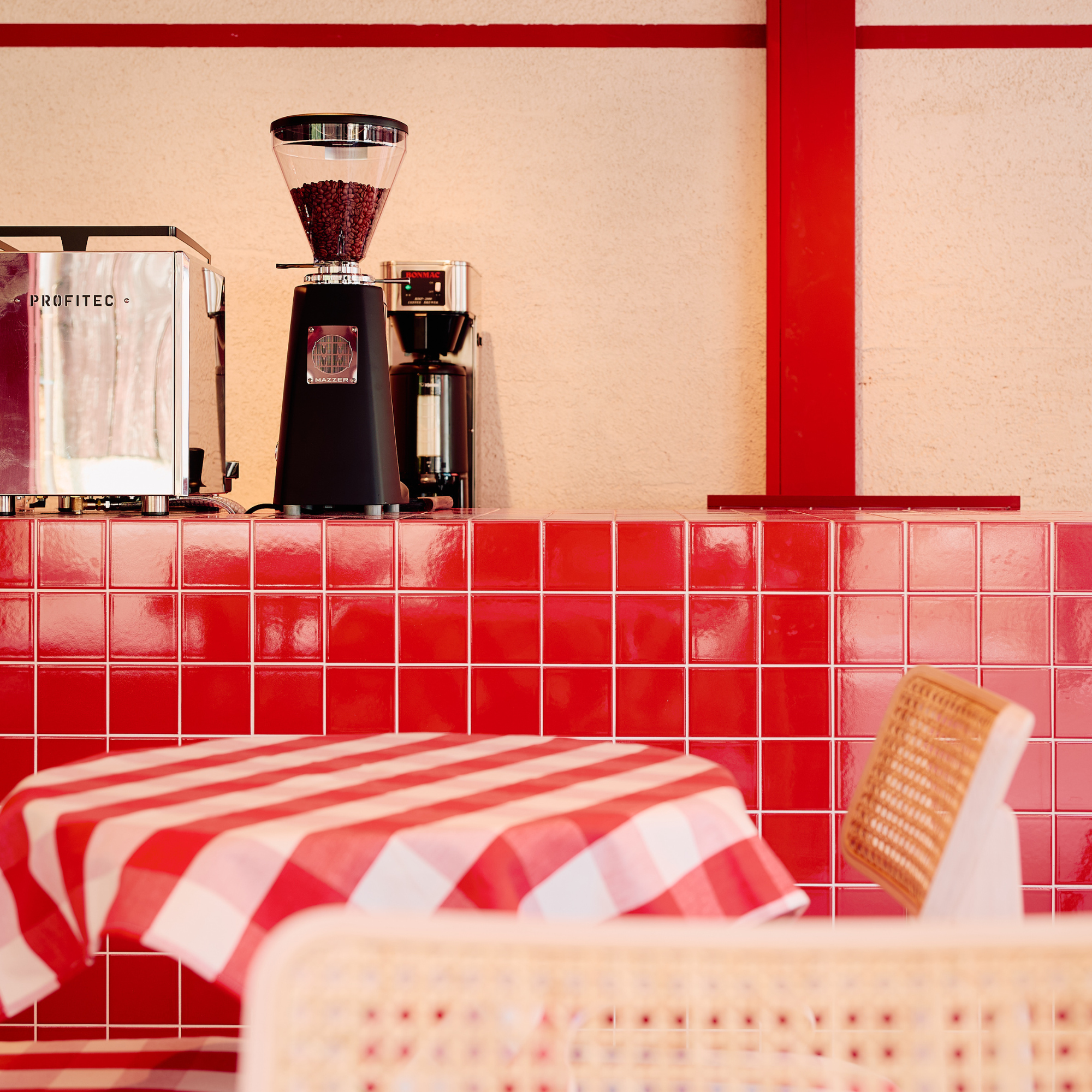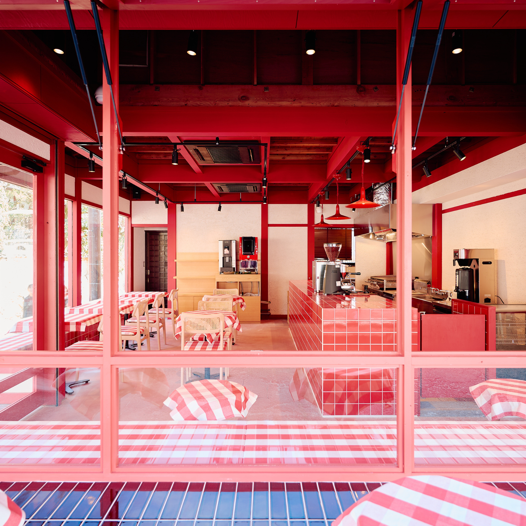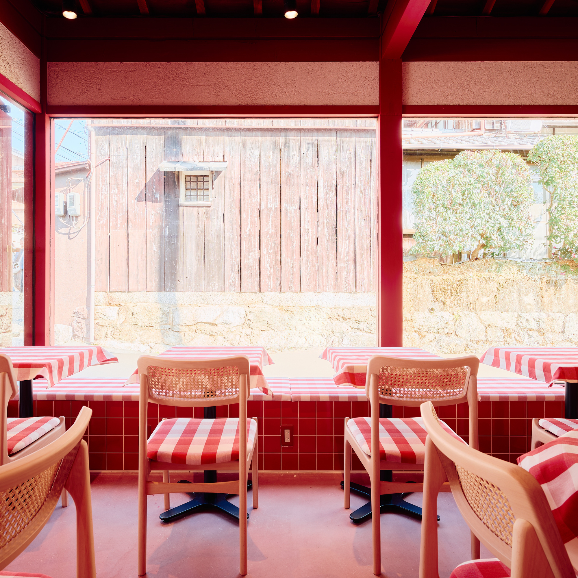 赤を基調に、ギンガムチェックやストライプのオーニングを取り入れ、